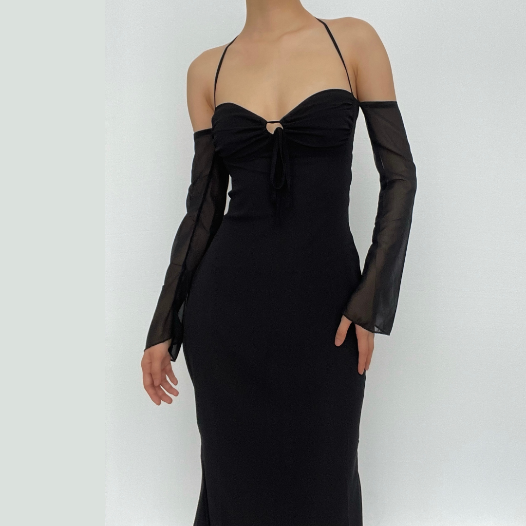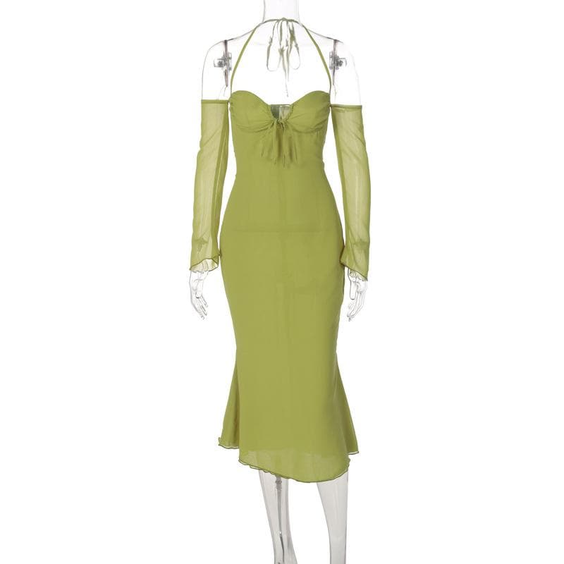 Low cut halter off shoulder long flared sleeve midi dress