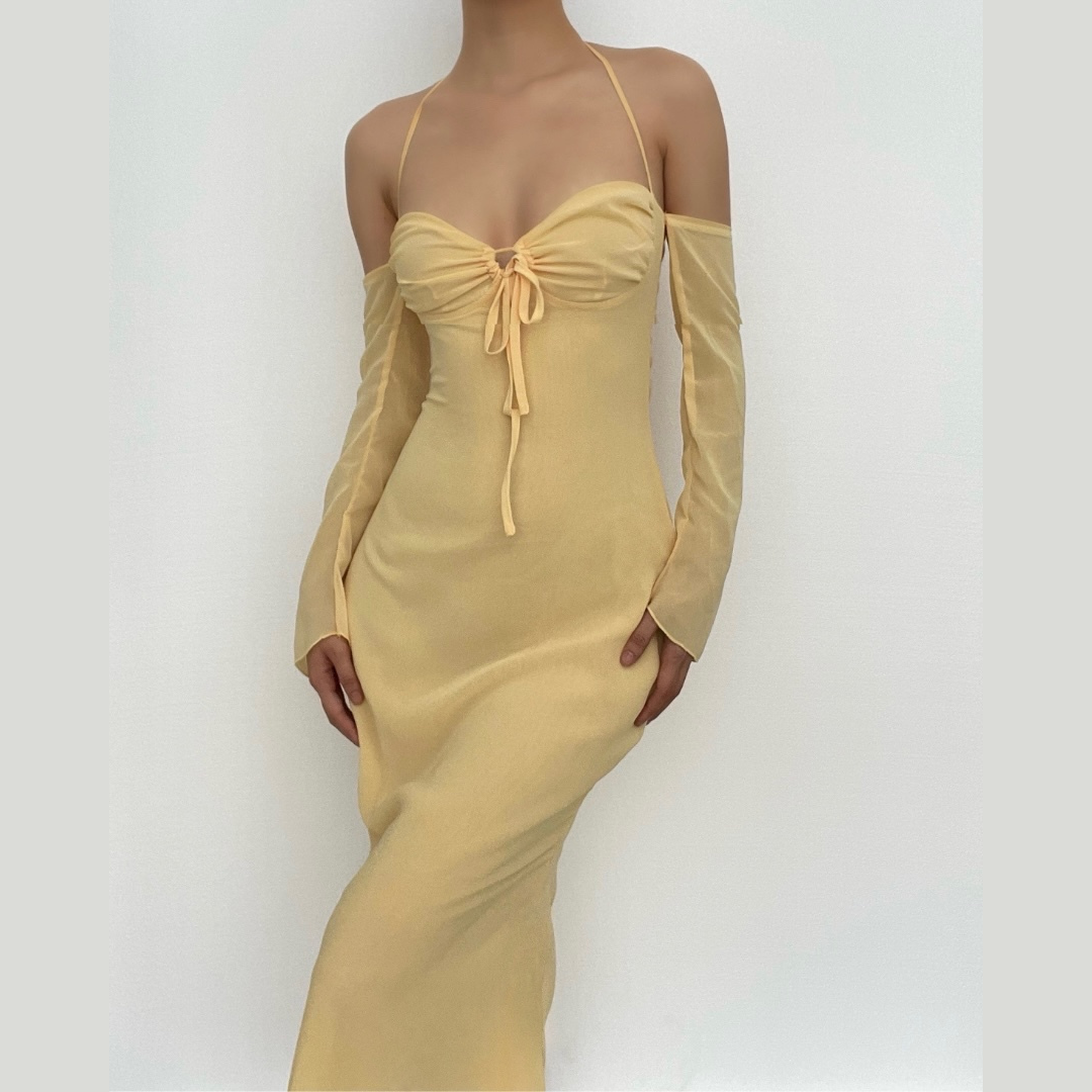 Be the first to review “Low cut halter off shoulder long flared sleeve midi dress”