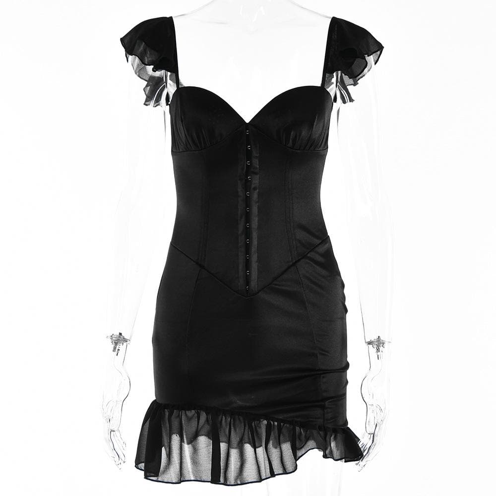 Solid ruched cap sleeve ruffle button mini dress